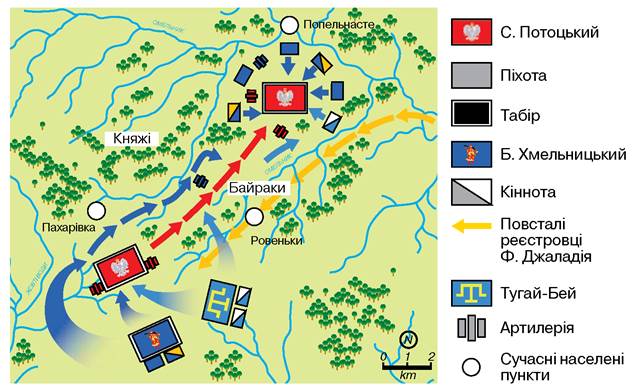 За допомогою карти (с. 103) відстежте шлях козацького війська і місця переможних битв початкового періоду війни. Окресліть території, які опинилися під владою Б. Хмельницького.