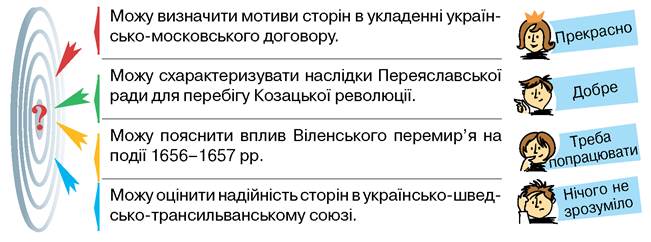 Оцініть свої успіхи в опануванні теми «Українсько-московський договір 1654 р. Воєнно-політичні події 1654-1657 рр.».