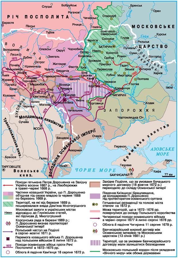 - До Османської імперії переходив південь Київщини, Поділля; за Московією залишалося Лівобережжя та Київ з округою.