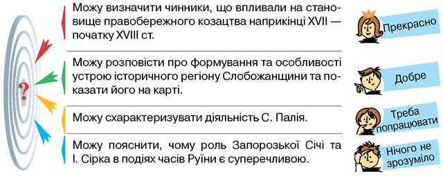 Оцініть свої успіхи в опануванні теми «Правобережне козацтво. Заселення і розвиток Слобідської України. Слобідські козацькі полки. Запорозьке козацтво. Іван Сірко».