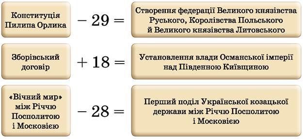 Виконайте завдання на лічбу часу, визначте історичні дати. Увідповідніть результати своїх обчислень із короткими описами історичних подій. Запропонуйте власний варіант завдання, використовуючи знання про угоди між гетьманами доби Руїни й Московським царством, Річчю Посполитою або Османською імперією. Запропонуйте однокласникам/однокласницям розгадати ваші задачі.