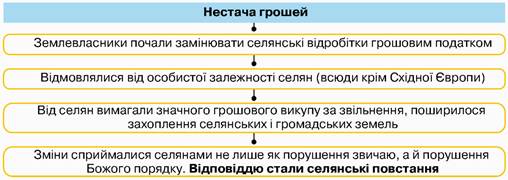 З розвитком міст землевласницьке і селянське господарства все більше втягувалися у торговельні відносини. Розвиток торгівлі призвів до появи нових товарів, які неможливо було виробити у власному господарстві. Дорогі тканини, вина, предмети розкоші можна було придбати тільки за гроші, а їх не вистачало.