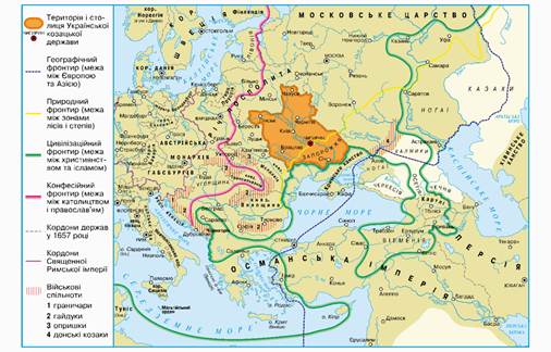 На початку раннього Нового часу українських Великих фронтирів було кілька: один пролягав між землеробами «Лісу», скотарями «Степу» та «Морем», де османи підтримували зв’язок із Середземномор’ям; другий — між світом християнства та ісламу; третій — між західним і східним християнством; четвертий — між європейською та азійською політичними традиціями.