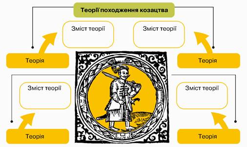 В історичній літературі існує кілька теорій походження козацтва: «хозарська», «уходницька», «утікацька» тощо. Скориставшись додатковими джерелами інформації, визначте власне ставлення до цих теорій. Сформулюйте власну точку зору щодо походження козацтва. Відобразіть теорії походження козацтва та їхню сутність за допомогою інфографіки.