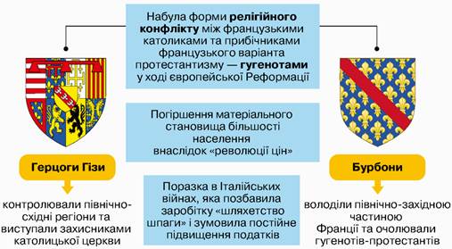 Об’єднайтеся в групи. За допомогою матеріалів параграфа та додаткових джерел інформації створіть інфографіку «Громадянська війна у Франції». Визначте позиції у війні: 1) прихильників Гізів; 2) прихильників Бурбонів. За результатами роботи укладіть коротку історичну довідку для української вікіпедії.