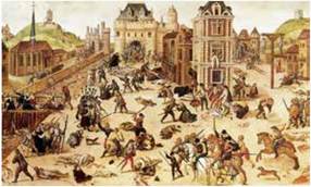 Перші 10 років війни минули без суттєвих загострень. Проте спроба примирення через шлюб лідера гугенотів Генріха Бурбона і сестри короля Маргарити завершилася різаниною гугенотів, які прибули на весілля, католицькими загонами герцога Гіза. Це сталося 24 серпня 1572 р., в день Святого Варфоломія, і увійшло в історію під назвою Варфоломіївська ніч.