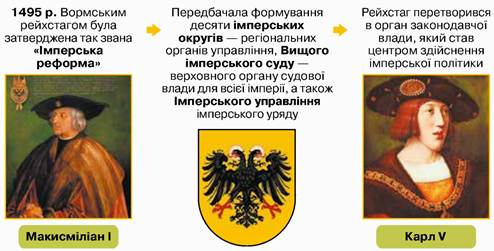 • До участі в управлінні імперією були залучені основні соціальні стани країни: курфюрсти, імперські князі, імперські лицарі, містяни, між якими сформувався стійкий баланс влади