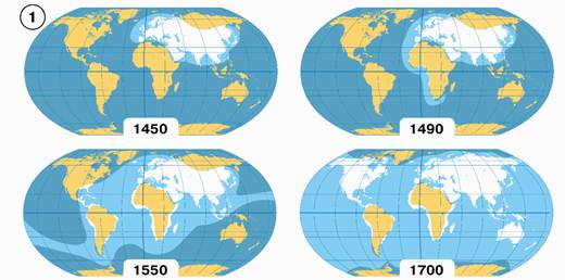 Розгляньте зображення № 1. Порівняйте карти. Які зміни відбулися внаслідок Великих географічних відкриттів? Подумайте, як це вплинуло на економку країн Європи та світу.
