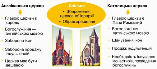 Розгляньте схему, подану на наступній сторінці. Порівняйте католицьку та англіканську церкви. Чи всі підтримували нову церкву? Які верстви населення, на вашу думку, були зацікавлені у збереженні католицької церкви?