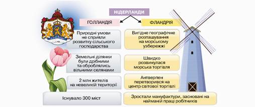 Розгляньте інфографіку. Які особливості мав розвиток Нідерландів у ранній Новий час? Які з наведених фактів сприяли розвитку країни, а які справили негативний вплив?