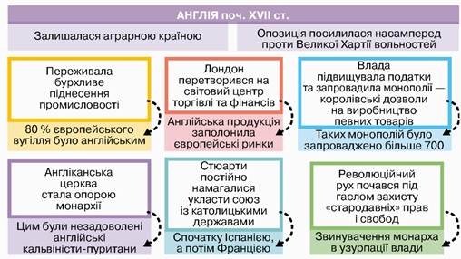 Опрацюйте інфографіку. Складіть коротку розповідь про становище Англії на початку XVII ст.