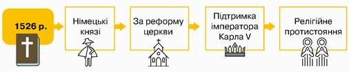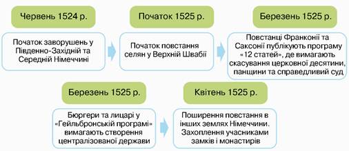 Проаналізуйте схему, подану на наступній сторінці. Визначте передумови, причини та наслідки релігійної війни 1524-1525 рр. у Німеччині.