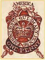 Пробний відбиток однопенсової гербової марки Англії, призначеної для північноамериканських колоній, 1765 р.