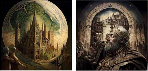 Розгляньте зображення, згенеровані ШІ. Як штучний інтелект «побачив» світогляд та уявлення про простір і час ранньомодерної людини? Проаналізуйте зображення, спираючись на матеріали параграфа.