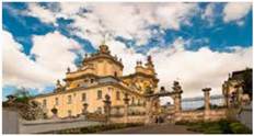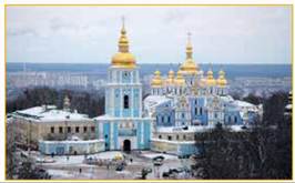 Михайлівський Золотоверхий собор у Києві (характерний приклад стилю українського бароко, 1113 рік, перебудовано за сприяння гетьмана Івана Мазепи у XVIII ст.)