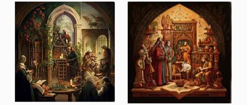 Розгляньте зображення, згенеровані за допомогою штучного інтелекту. Подумайте, який запит надавали ШІ автори підручника, щоб отримати такий результат. Яке місце у зображеннях відводиться науці і природі?