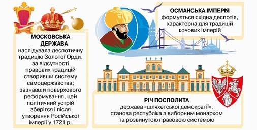 Соціальний та економічний розвиток відбувалися на тлі важливих політичних перетворень. Потреби економічного зростання та боротьба за ринки посилили конкуренцію між європейськими державами, а вона потребувала подальшої централізації — держави Західної Європи перетворюються на абсолютні монархії. Водночас вони зберігали європейські правові традиції та певний баланс між соціальними групами. Іншим шляхом пішли Московська держава та Османська імперія.