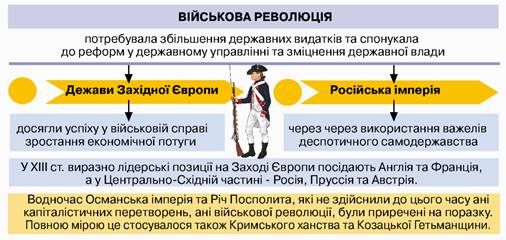 8. У XVII—XVIII ст. в Європі відбулася ще і військова революція — зміни в озброєнні війська, стратегії і тактики ведення війни, створення великих професійних найманих армій, запровадження військової освіти і постійного вишколу.