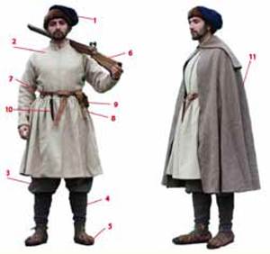 Уважно розгляньте історичну реконструкцію козацького строю. Спробуйте визначити на ньому елементи з поданого списку: шапка, сермяга, штани, панчохи, постоли, самопал, шкіряний пасок, ложка в чохлі, шкіряна сумочка, ніж у шкіряних піхвах, опанча.