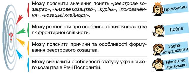 Оцініть свої успіхи в опануванні теми «Соціальна організація, побут і військова майстерність українського козацтва. Реєстрове козацтво».