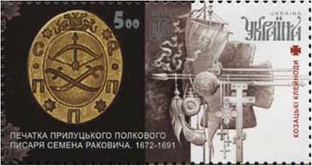2. Виконайте спільно в групах дослідження поштової марки «Козацькі клейноди». Визначте, які символи козацтва зображено на ній.