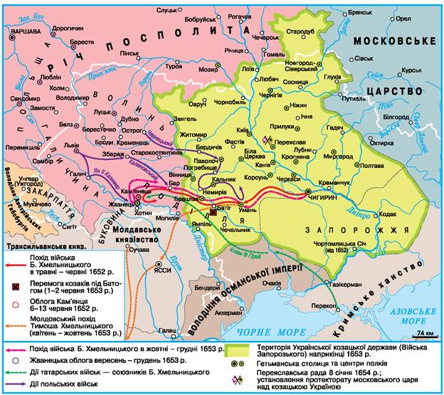 • 1. Покажіть на карті, як розгорталися події війни в 1652-1654 рр.