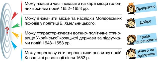 Працюючи з текстом параграфа, продовжуйте заповнювати таблицю на с. 107. Визначте, з якими труднощами зустрівся Б. Хмельницький у 1652-1653 рр. Поміркуйте, що було причинами складного становища Війська Запорозького. Уявіть себе учасниками наради в гетьмана — запропонуйте шляхи виходу зі скрутного становища.