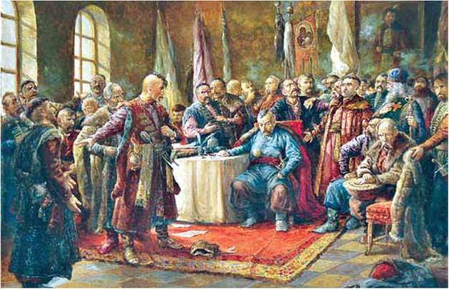 Складна зовнішньополітична ситуація диктувала свої умови, тому 18 січня 1654 р. Б. Хмельницький і старшина в церкві Переяслава присягнули на вірність царю. Своєю чергою московський посол передав гетьману від царя символи влади: прапор, боярську шапку, ферязь (парадний одяг можновладців у Московії) і булаву. Проте частина українського суспільства була проти угоди з Московією.