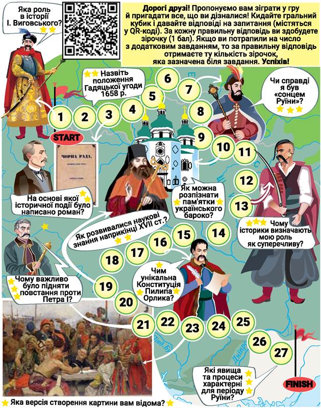 Виконайте завдання на лічбу часу, визначте історичні дати. Увідповідніть результати своїх обчислень із короткими описами історичних подій. Запропонуйте власний варіант завдання, використовуючи знання про угоди між гетьманами доби Руїни й Московським царством, Річчю Посполитою або Османською імперією. Запропонуйте однокласникам/однокласницям розгадати ваші задачі.