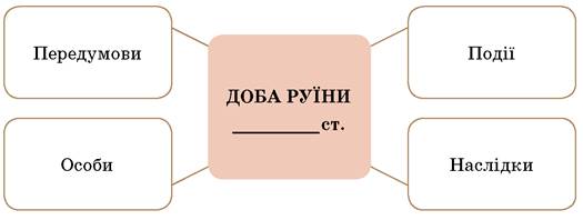 Пригадайте історію доби Руїни та заповніть узагальнювальну блок-схему. Для раціональнішого використання часу об’єднайтеся в творчі групи.