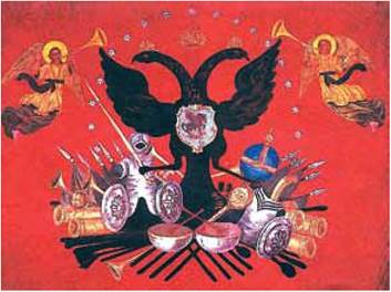 Спробуйте пояснити символіку козацької корогви. Знайдіть на ілюстрації зображення козацьких клейнодів. Які із символів ви вважаєте імперськими?