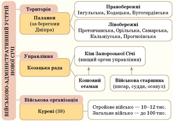 - 1. Уважно опрацюйте схему «Військово-адміністративний устрій Нової Січі» й карту на другому форзаці підручника та складіть розповідь про територіальну організацію, військо й органи управління Січчю.