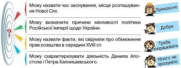 Оцініть свої успіхи в опануванні теми «Відродження гетьманства. Данило Апостол. Правління гетьманського уряду. Нова Січ».