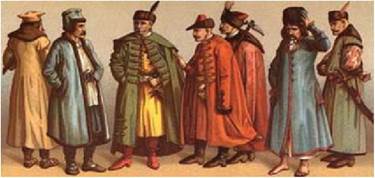 Різні категорії шляхти (реконструкція костюмів Огюста Расіне, XIX ст.)
