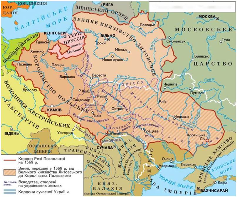 1. Визначте за картою назви й центри воєводств в українських землях, що за Люблінською унією увійшли до складу Королівства Польського.