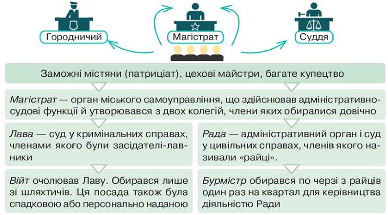 У багатьох українських містах діяло магдебурзьке право — звід норм» яким регулювалися права міст на самоврядування» власне судочинство, систему оподаткування. Містяни мали право власності, платили податки в міську казну, виставляли ополчення.
