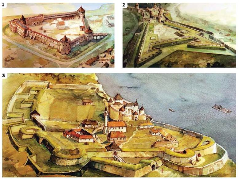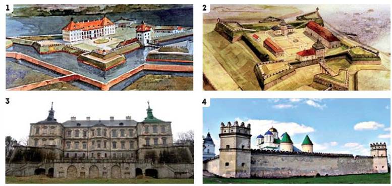 1. Розгляньте найвідоміші українські фортеці, зображені на сучасній світлині та художніх реконструкціях Збіґнєва Щепанека. Що спільного в їхній архітектурі?