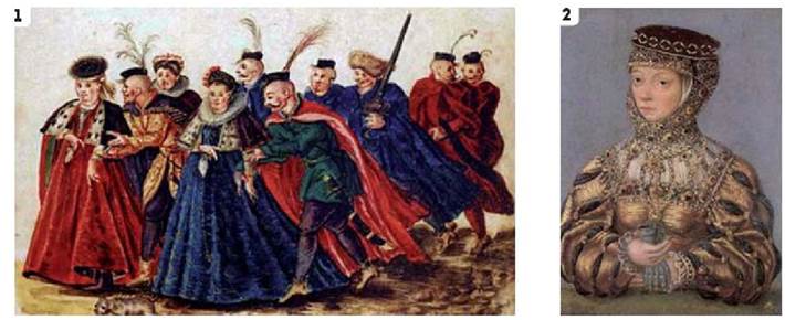 1. Що вказує на заможність людей, зображених на ілюстраціях? Яку нову для вас інформацію містять джерела щодо матеріалів, крою, шиття та оформлення одягу, тогочасної моди? Сформулюйте не менш ніж 5-6 положень.