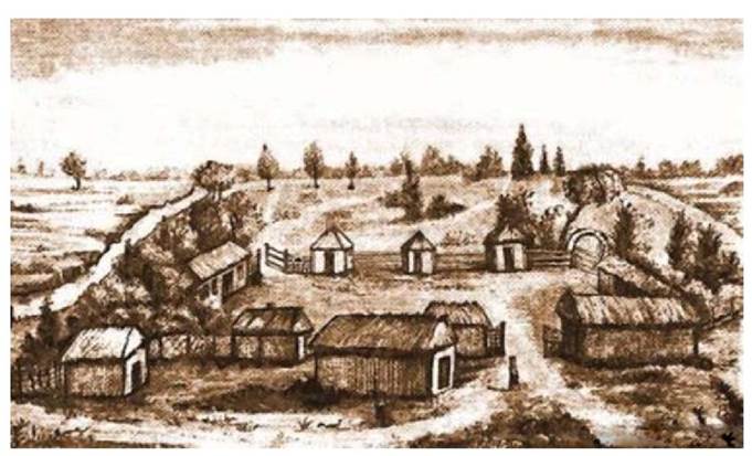 Запорозький хутір. Малюнок із книжки відомого дослідника історії козацтва Дмитра Яворницького «Запорожжя в залишках старовини і переказах народу», 1889 р.