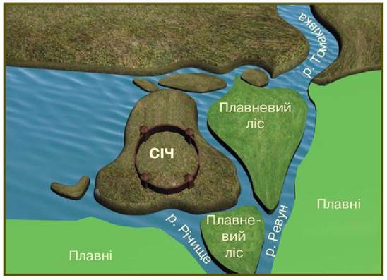 Знайдіть на схематичній карті Січі, які існували впродовж історії Запорозького війська. Що спільного було в їхньому розташуванні? За реконструкцією поясніть, як зазвичай розташовувалися Січі.