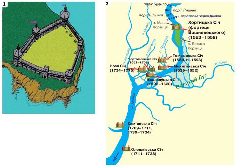 У 1556 р. канівський і черкаський староста Дмитро Вишневецький звів за дніпровими порогами в районі острова Хортиця укріплений замок-фортецю, об’єднавши козаків у першу відому нам сьогодні Запорозьку Січ, місцезнаходження якої є й досі дискусійним.