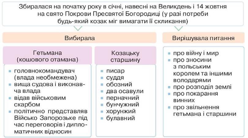 1. На основі схеми (с. 96) поясніть, які органи керували Січчю. Як їх формували? Які функції були в кожного з них? Про що свідчить наявність виборних посад на Січі? Чи правильним є твердження істориків, що Запорозька Січ була демократичною республікою?