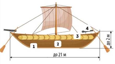 4 — на чайках установлювали артилерію; уздовж кожного борту сиділо 10-15 веслярів, а при попутному вітрі ставили вітрило