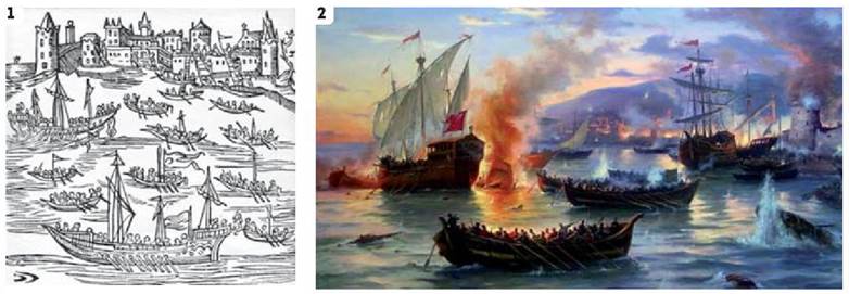 3. Розгляньте ілюстрації. Які епізоди походу відображено на гравюрі й сучасній реконструкції події?
