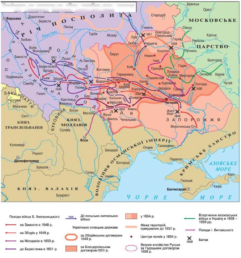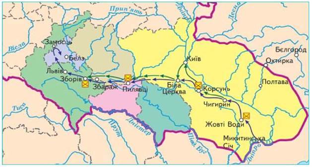 Покажіть на карті три основні місця подій, які описано в тексті. Простежте шлях війська Хмельницького протягом 1648 р.