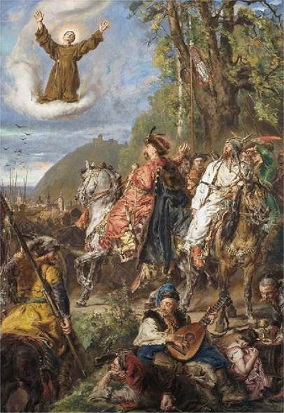 1. В основі картини Яна Матейка (с. 136) лежить легендарний сюжет, пов’язаний з облогою Львова 1648 року козацькими й татарськими військами. Розповідали, нібито під час спроби штурму над містом з’явилася фігура ченця: стояв він навколішки, зі зведеними догори руками. Побачивши таємничу постать, Хмельницький начебто віддав військам сигнал зупинитися й відступити від міських мурів.