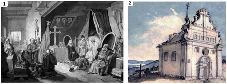 2 — Тарас Шевченко. Богданова церква (Іллінська церква в Суботові, споруджена коштом гетьмана. Усипальниця Богдана Хмельницького. Акварель, 1845 р.)