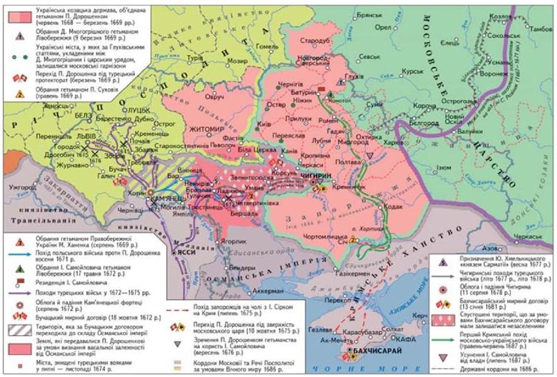 За часів Руїни територію Правобережної України було поділено між Річчю Посполитою та Османською імперією. За Вічним миром 1686 р. з Московським царством Річ Посполита підтвердила право власності на Північну Київщину, Галичину й Волинь. За Бахчисарайським договором 1681 р. з Московським царством Османська імперія отримала Південну Київщину, Брацлавщину й Поділля, де до 1685 р. гетьманував Юрій Хмельницький. Унаслідок боротьби різних держав за Правобережжя ці воєводства було спустошено й майже обезлюднено.