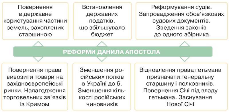 2. Зважаючи на реальні обставини, Данило Апостол узявся за здійснення реформ, спрямованих на впорядкування внутрішнього життя Гетьманщини. На основі схеми визначте, які реформи запровадив Данило Апостол, і поясніть, який вплив на життя України мала кожна з них.