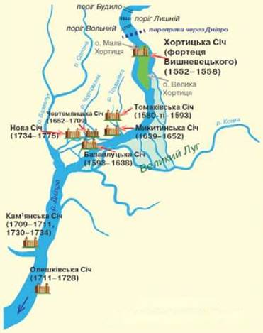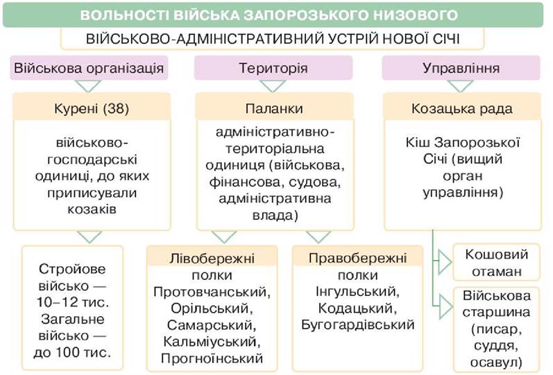 Знайдіть на картосхемі (с. 222) і на карті (с. 240) розташування останніх трьох Січей. Опишіть, як запорожці розбудували Нову Січ. Що в її облаштуванні було традиційним, а що — ні? (Порівняйте реконструкцію на с. 222 з ілюстрацією на с. 93.)